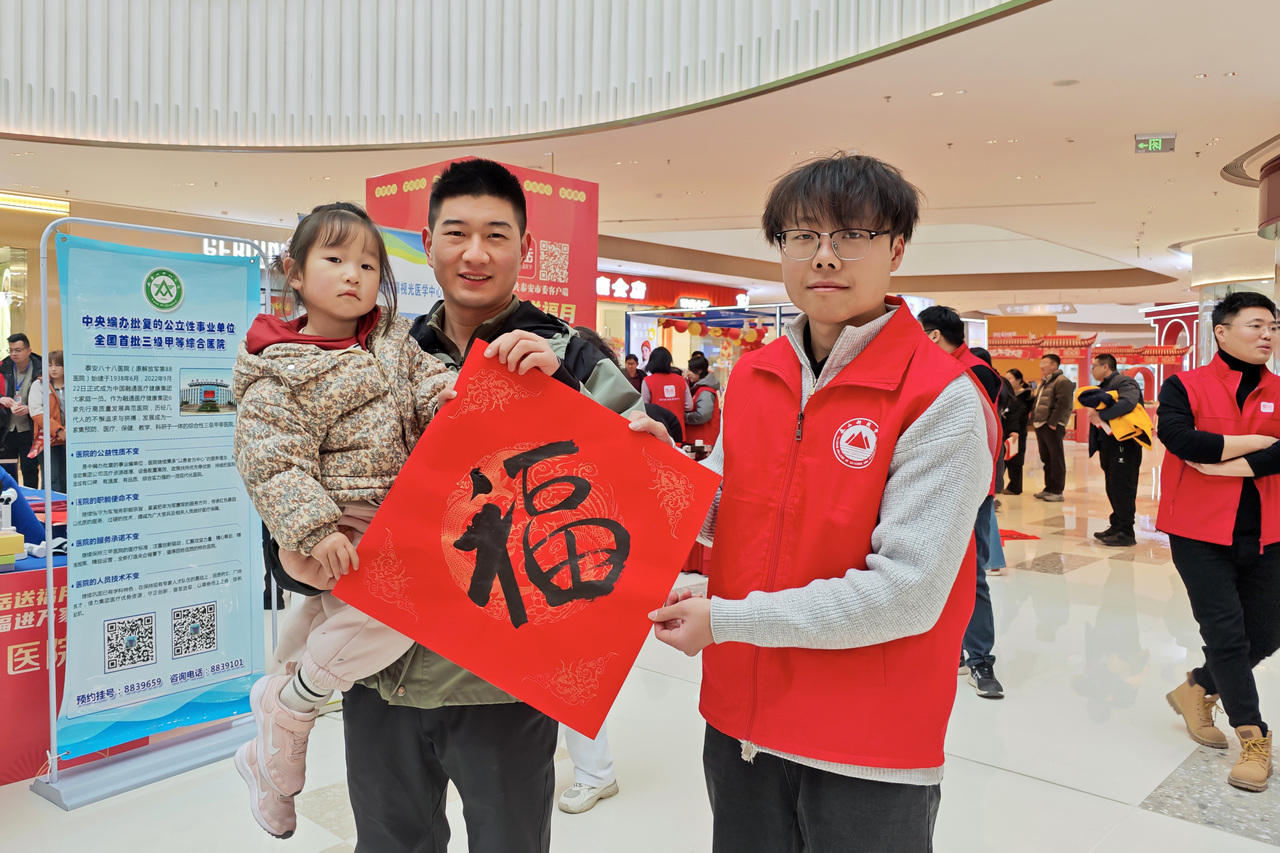 近日,在山东省泰安市泰汶吾悦广场,泰山科技学院红马甲志愿者正把刚刚写好的“福”字送给逛超市买年货的市民群众。