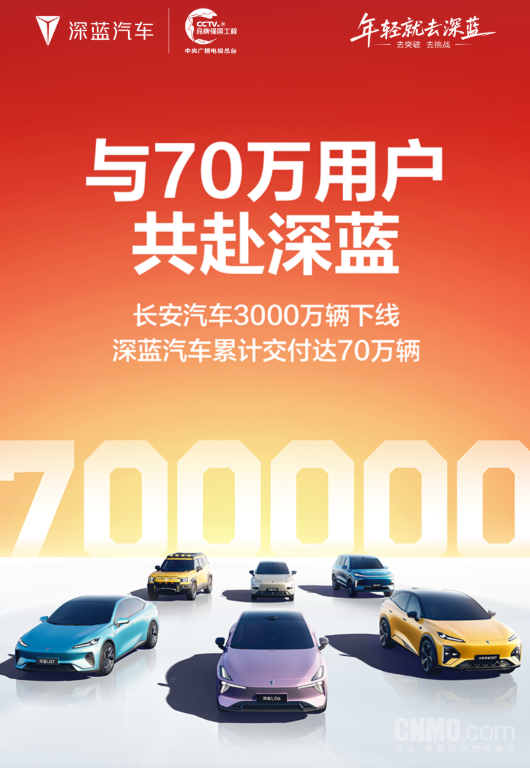 【CNMO科技消息】12月9日,深蓝汽车宣布,其累计交付量正式达成70万辆大关。