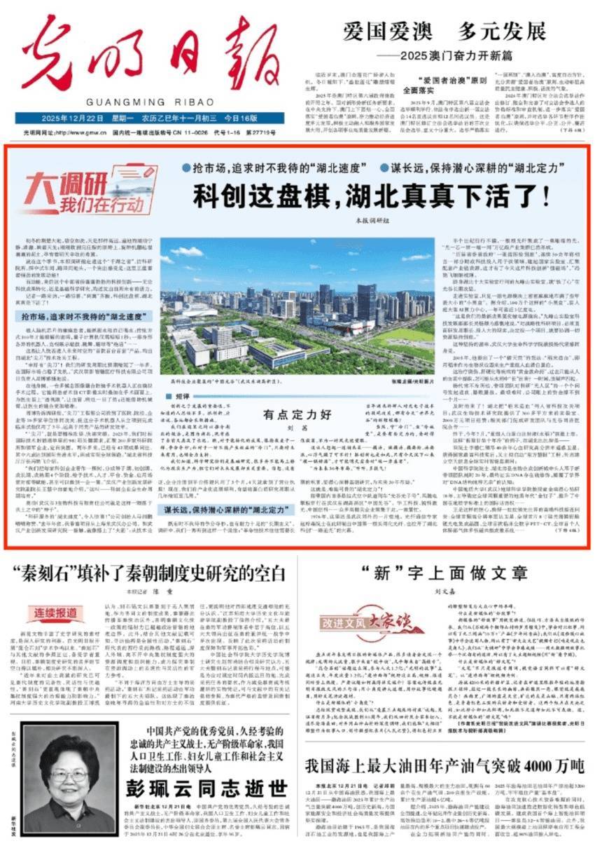 今天(12月22日),光明日报聚焦湖北科技创新,在头版头条“大调研我们在行动”专栏推出《科创这盘棋,湖北真真下活了!》。以下为报道全文: